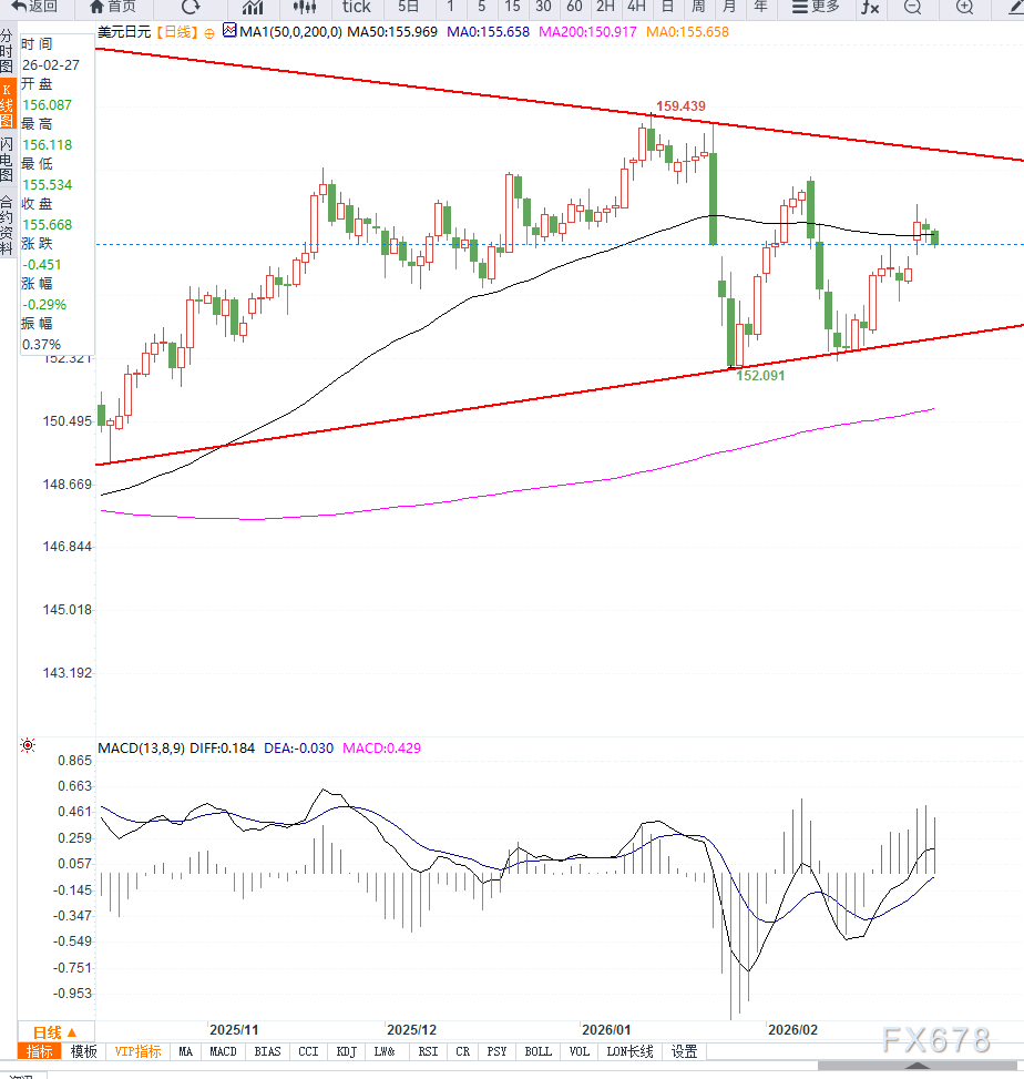 上方阻力位于157.00整数关口,突破后可能测试158.50甚至160.00区域。